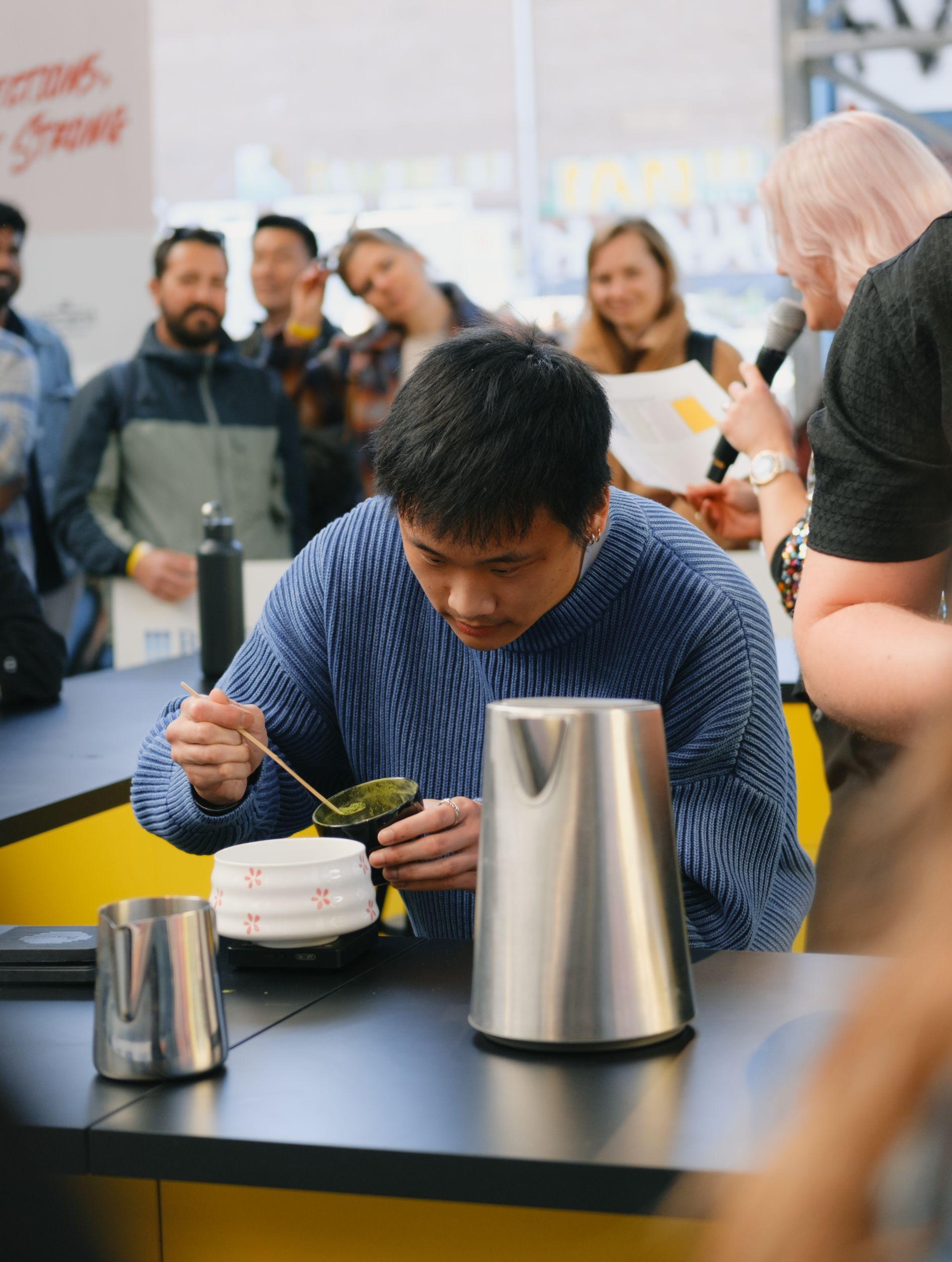 Ils disposent d’un maximum de 4 minutes pour (peser, tamiser et) fouetter le matcha, faire mousser la boisson lactée/végétale fournie par le sponsor, créer leur meilleur Matcha Latte Art et présenter leur boisson aux juges.